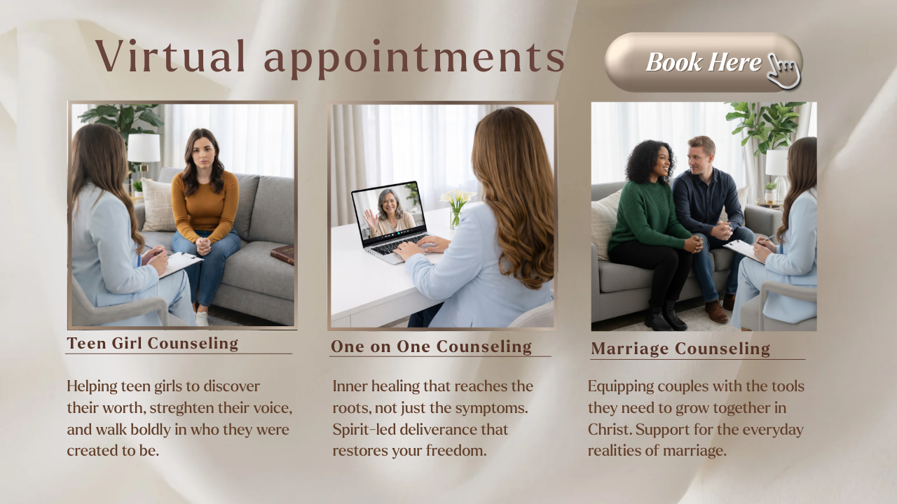 Our counseling services provide a safe, compassionate space for deep healing, personal growth, and lasting restoration. We believe true wholeness comes when every part of your life emotional, mental, and spiritual is cared for with wisdom and grace. Whether you are navigating transition, grief, stress, relational challenges, or simply longing for deeper peace, you do not have to walk through it alone. Guided by truth, grounded in compassion, and led by the Holy Spirit, we walk with you through every season helping you heal what has been wounded, strengthen what is fragile, and step forward in clarity, freedom, and wholeness.